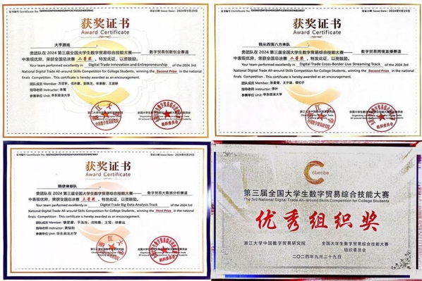 9月27日至29日,第三届全国大学生数字贸易综合技能大赛全国总决赛在杭州落下帷幕。商学院3支参赛队伍分别荣获创新创业赛道二等奖、数字贸易跨境直播赛道二等奖和数字贸易大数据分析赛道三等奖,我校荣获“优秀组织奖”。