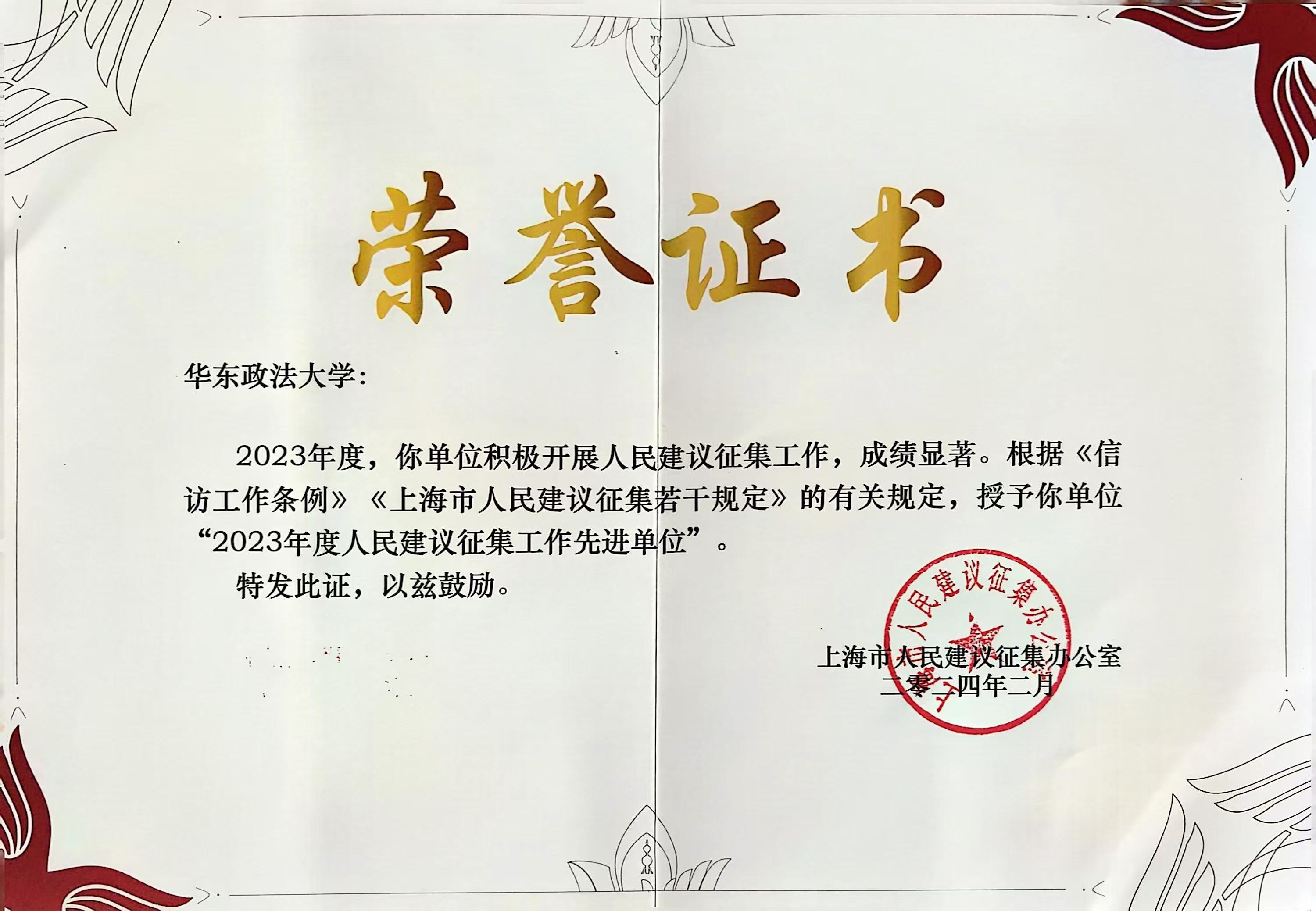 2023年,我校深入贯彻落实党的二十大和二十届三中全会精神,以习近平法治思想为指引,坚持和发展新时代“枫桥经验”,积极开展人民建议征集工作,坚持理论与实践相结合,学术与应用相融合,坚持问题导向和效果意识,创新学习宣传形式,围绕贯彻落实《信访工作条例》,实施培养德法兼修高素质专业人才,获评2023年度上海市人民建议征集工作先进单位,这也是我校第三次获评此殊荣。