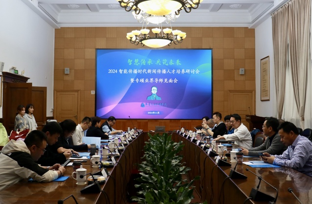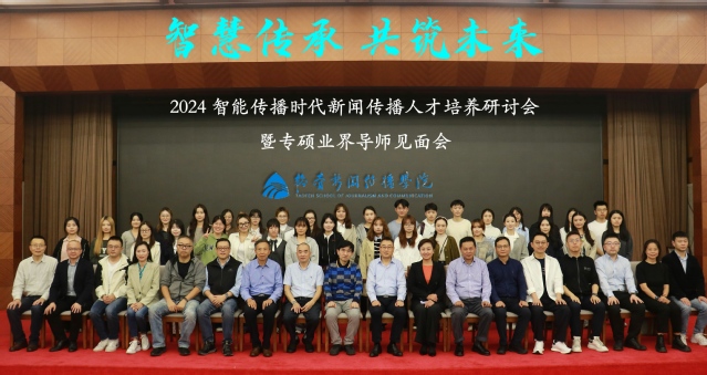 我校韬奋新闻传播学院“智慧传承 共筑未来”——2024智能传播时代新闻传播人才培养研讨会日前在长宁校区举办。来自上海广播电视台、爱奇艺、劳动报、法治日报、城市之窗文化科技、律新社、纬景储能、上海市松江区新闻工作者协会、浙江法治报、浙江省嘉兴市文艺两新发展促进会等多家单位的业界专家受邀莅临会议,韬奋新闻传播学院院长范玉吉、副院长胡慧源,学院导师代表及新闻与传播专业硕士全体新生参会。