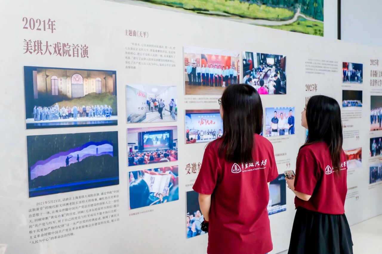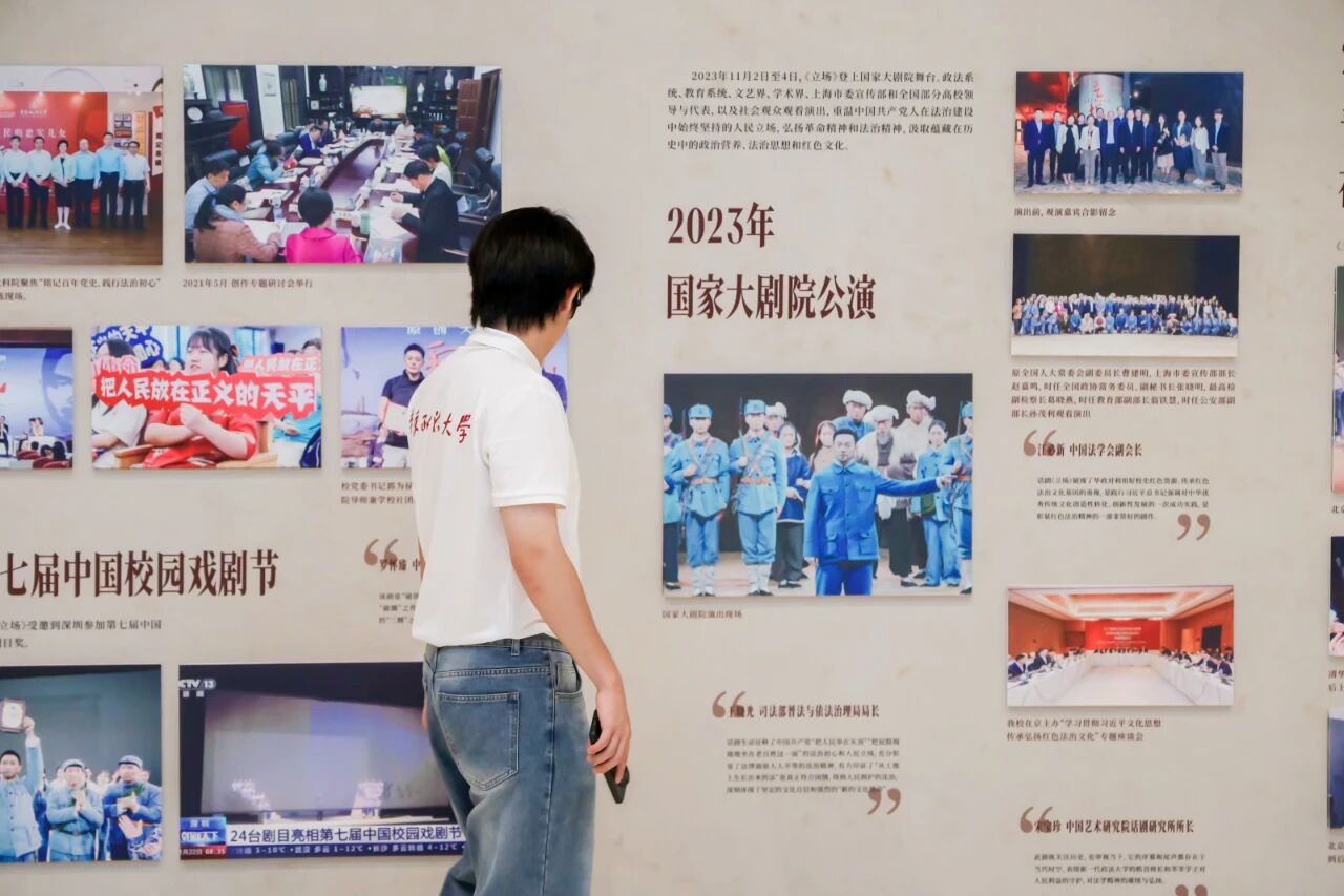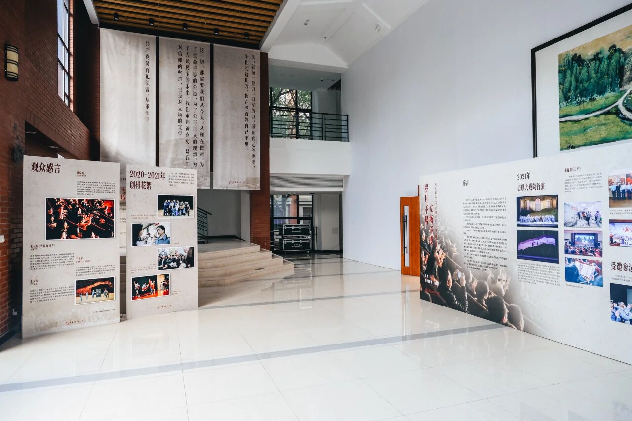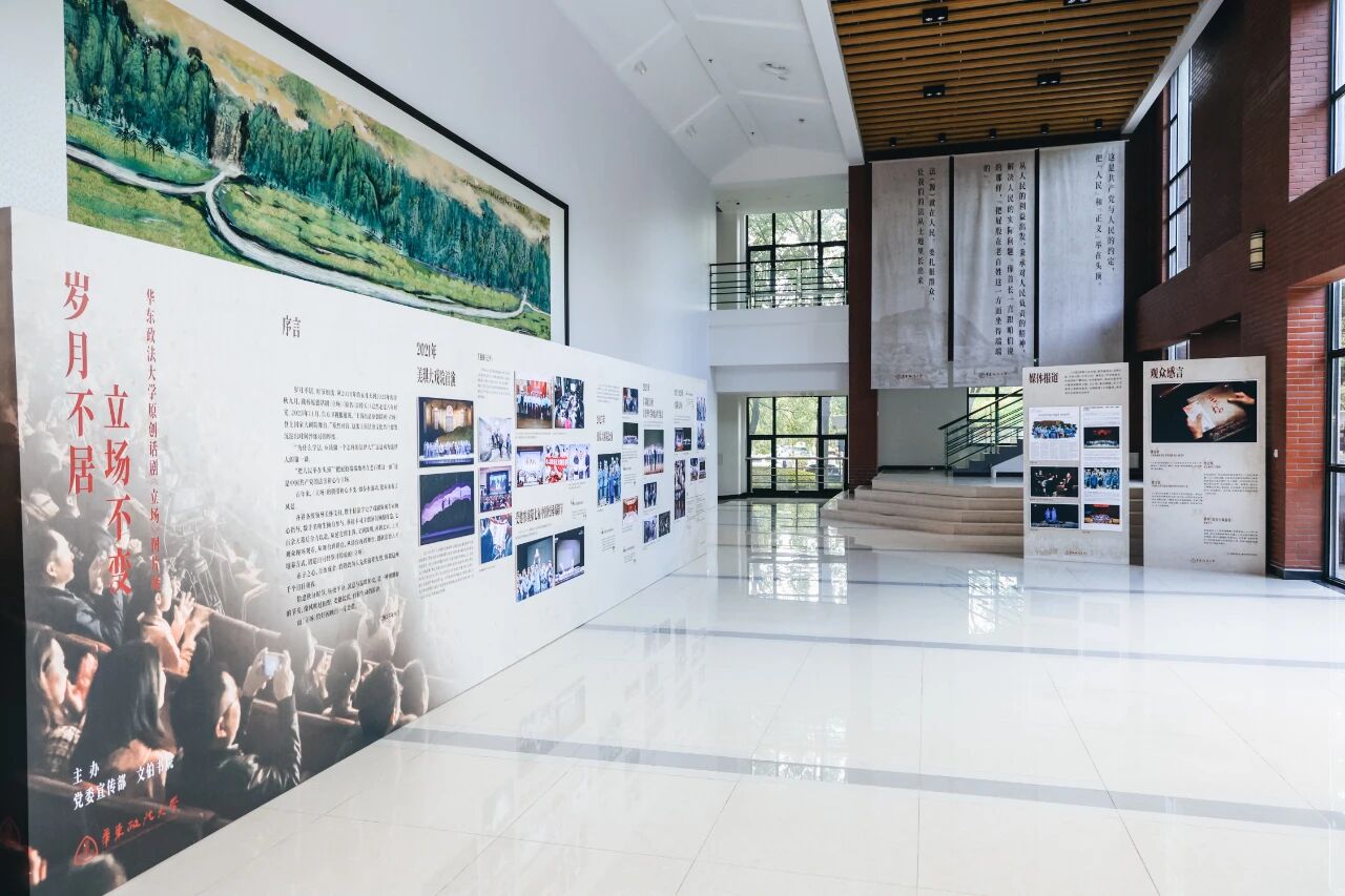 演出同步通过学校官方视频号进行直播,累计6千人次观看。同时,《岁月不居 立场不变——华东政法大学原创话剧<立场>图片展》在缘法厅大厅进行首展,回望法治人才培育初心。