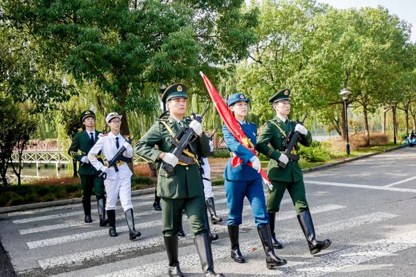 一旁的国旗护卫队格外引人注目——我校国旗护卫队与华政附高国旗班队员并肩而立,他们身着整齐制服,眼神坚定如炬。“稳住步伐,注意摆臂高度。”升旗仪式开始前,我校国旗护卫队的学长拍拍附高学弟的肩膀,手把手调整他的姿势,耐心叮嘱动作要领,一同将鲜艳的五星红旗护送至旗杆下。