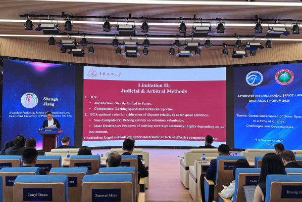论坛共设三场专题研讨,蒋圣力在“新时代的商业航天活动治理”专题研讨环节作题为“商业航天活动中国家与非国家主体的争端解决路径”的发言(合作作者学院硕士生、研究所研究助理王嘉倩),就商业航天活动中国家与非国家主体争端的特殊之处,以及既有国际政治和法律机制在处置上述特殊争端中的不足进行了分析、阐释,并提出了如何构建更具适应性、合理性和可操作性的复合型争端解决机制的整体思路和具体举措。