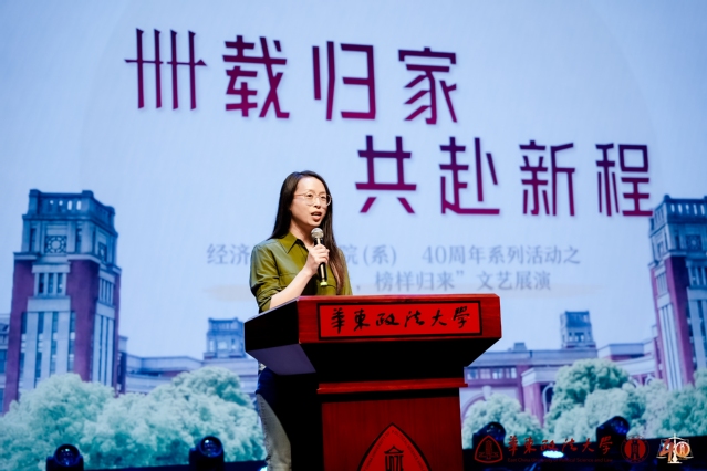 当晚,“新生力量,榜样归来”文艺展演在明镜楼缘法厅温情上演,经济法学院党委副书记鲁凤向校友们致以诚挚感谢,寄语学子传承“逆境中崛起、忧患中奋进、辉煌中卓越”的华政精神,并表示学院将牢记育人使命,打造独具特色的海派经济法教育高地,为法治事业培养“德法兼修”的优秀人才。