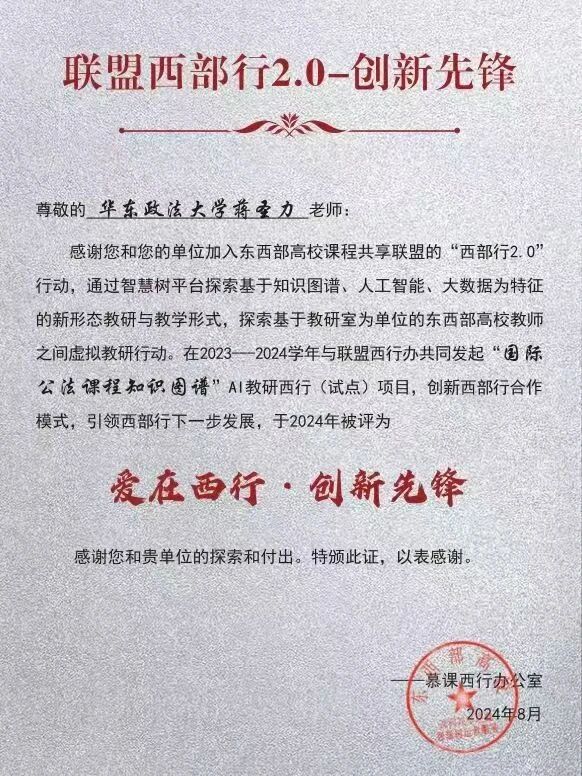 为积极响应慕课西部行2.0行动,探索创新教研与教学形式,推动西部教育发展从“输血”向“造血”转变,今年我校国际法学院《国际公法》课程教学团队联合东西部高校课程共享联盟西部行办公室发起了“国际公法课程知识图谱新形态教研西行” 新形态教研西行试点项目。