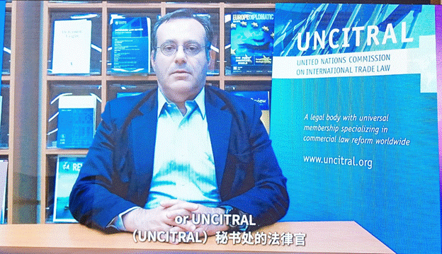 卢卡・卡斯特拉尼法律官员围绕数字技术和电子单证的国际法治,以联合国贸法会的立法工作视角介绍了UNCITRAL在电子商务、电子可转让记录、身份管理、自动化合同等领域的示范法与公约,强调技术中立、功能等同、非歧视三大原则。他特别认同《海商法》修订、区块链赋能电子单证立法等方面的实践,认为中国正走在数字贸易立法的前沿。