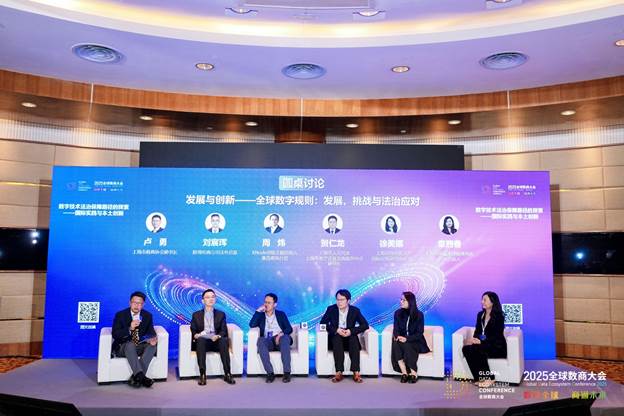 圆桌研讨环节邀请了来自跨境电商、科技创新企业、行业组织、高校研究机构及律师行业的多位嘉宾,包括跨境电商公司法务总监刘宸珲、XNode创极无限创始人兼首席执行官周炜、上海市数字企业出海服务协会秘书长贺仁龙、上海对外经贸大学国际经贸研究所研究员徐美娜、上海功承瀛泰律师事务所高级合伙人章煦春,围绕“全球数字规则:发展、挑战与法治应对”展开深入讨论。嘉宾阵容覆盖数字贸易、创新创业、企业出海服务、国际规则研究与专业法律服务等多个关键领域,充分体现出数字治理议题的跨界属性与复合性。他们从全球数字规则重塑、跨境数据流动、平台经济治理、企业合规体系建设、数字经贸规则对标、争议解决与跨境执行等多重维度切入,系统分析数字经济发展面临的制度挑战与机遇,探讨在复杂国际环境下中国企业如何以更成熟的法治理性参与全球竞争。圆桌研讨的观点交汇丰富、多维互补,不仅回应了当前数字经济发展中的核心问题,也为提升我国数字法治治理能力和构建开放、透明、可预期的数字治理体系提供了前瞻洞见与创新路径。