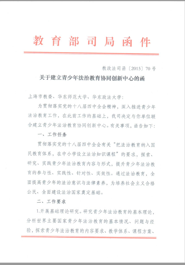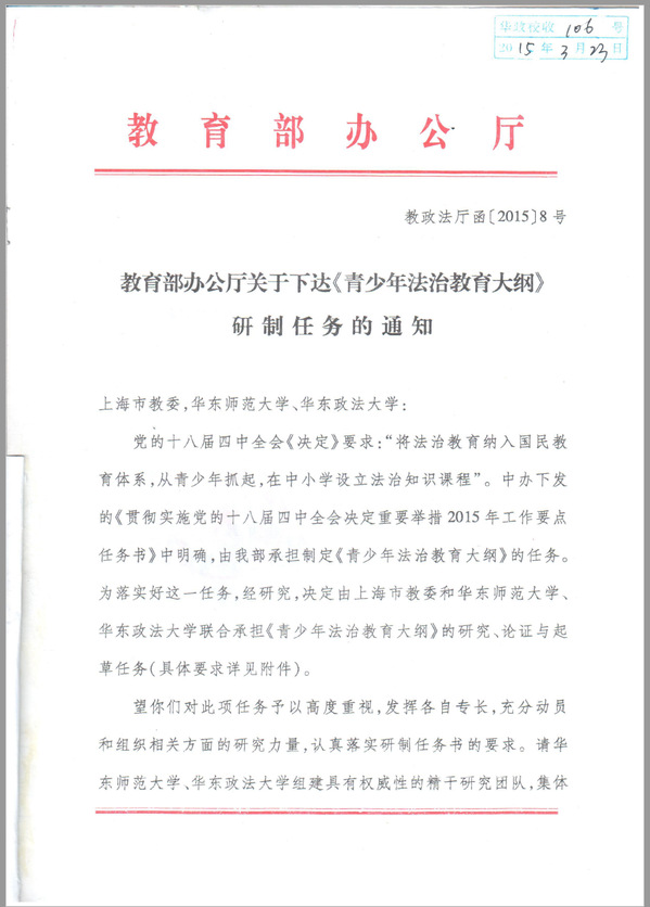 一直以来,我校都是青少年法治教育建设研究“重镇”。2015年,我校受托承担教育部重大攻关项目《青少年法治教育大纲》研制,2016年圆满完成任务,由教育部、司法部、全国普法办联合印发。依托青少年法治教育协同创新中心,我校还受托研制了《青少年法治教育大纲》解读本,参与编写《道德与法治》教材,组织编写《法治教育教师读本》《青少年税法读本》等教辅材料,开展《青少年法治素养评价指标体系》《法治教师教学能力提升》等专题研究,夯实法治教育理论与实践支撑。打造多元法治教育载体,参与国家和上海市“学宪法、讲宪法”系列活动出题、评审任务,承担国家“中小学法治课骨干教师”培训和上海市、海南省、内蒙古等省市中小学法治校长培训任务;依托60所实验校,围绕青少年法治教育落地机制,开展全面探索。