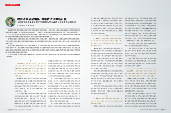 2023年11月24日,学校牵头平行组织开展教育法典编纂工作。同年,教育法典编纂研究纳入上海市教育工作领导小组年度工作要点。目前,教育法典总则篇形成专家建议稿,标志着依法治教进入新征程。