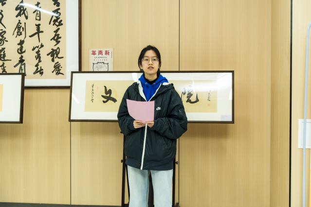 学生代表贾乔翎作为课程学习者与作品参展者,分享了学习体会与参展感想。她以传统白描课程为例,讲述在陶大珉老师的讲授示范和指导下,她从基础线条练习入手,逐步深入理解传统绘画的技法与审美,不仅找回了专注与平静,更学会了深度欣赏艺术作品,实现了从“完成作业”到“自我表达”的转变,并在跨学院的共同学习中,感受艺术连接心灵的力量。她特别感谢学校开设艺术通识课程、配备设备完善的书画教室和展厅,为学生创造“慢下来”感受美的空间,深刻体会到美育是大学教育中不可或缺的重要部分。