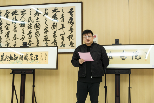 文伯书院艺术教育中心陶大珉老师介绍策展情况。他表示,本届展览相较于往届实现了多重突破。场地方面,从楼宇融合展示升级为独立完整的专业空间;展陈设计上,首次使用展墙搭建,从空间规划、灯光布置到画作装裱设计均精心打磨;展品方面,以陈志宏老师和华师大师生书法交流为契机,集中呈现经典白描艺术、现代绘画实践、摄影创意实践等多门美育课程的教学成果,让不同艺术媒介在同一美育语境下实现深度对话。他认为,美育展不仅是一场关于课程的展示和艺术交流,更是通过展览的的再次创作,形成一个具有丰富视觉层次的“美育现场”。