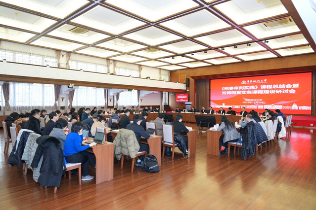 12月25日,学校在交谊楼基石厅召开《刑事审判实践》课程总结会暨双师同堂实务课程建设研讨会,全面总结课程建设经验,系统谋划实践教育教学改革方向。校党委副书记、校长肖凯,上海市高级人民法院党组成员、政治部主任王理秋,上海市政协社会和法制委员会副主任、上海市高级人民法院原党组成员、副院长黄祥青,上海市金山区人民法院党组书记、院长余剑等校内外领导专家出席会议,《刑事审判实践》课程师资团队、学生代表和首批立项课程团队代表、教务处和相关学院负责人与会交流研讨。会议由副校长洪冬英主持。