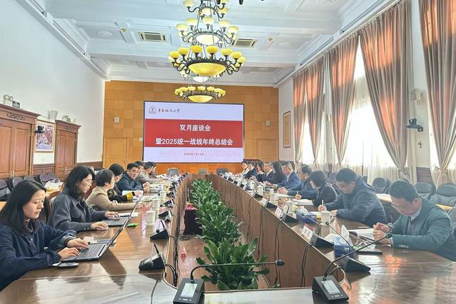 1月14日中午,我校双月座谈会暨2025年度统一战线年终总结会在长宁校区举行。校党委书记王宏舟,副校长洪冬英,校党委常委、统战部部长曲玉梁,统战部副部长周莉出席会议,学校各民主党派、统战团体负责人,以及各级人大代表、政协委员共同参会。会议由校党委副书记韩强主持。